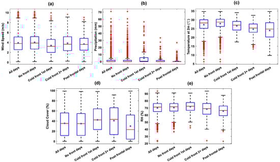 Box plots of (a) wind speed; (b) precipitation; (c) temperature; (d) cloud cover; (e) RH during each type of days (blue “*” represents the means; red lines are the medians; red “+” marks are the outliers).