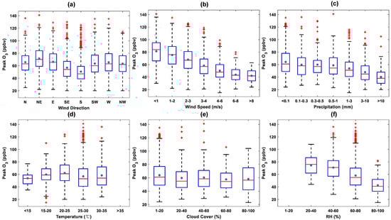 Box plots of peak O vs. (a) wind direction; (b) wind speed; (c) precipitation; (d) temperature; (e) cloud cover; (f) RH (blue “*” represents the means; red lines are the medians; red “+” marks are the outliers).