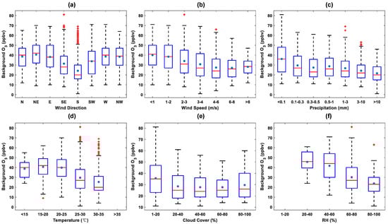 Box plots of background O vs. (a) wind direction; (b) wind speed; (c) precipitation; (d) temperature; (e) cloud cover; (f) RH (blue “*” represents the means; red lines are the medians; red “+” marks are the outliers).
