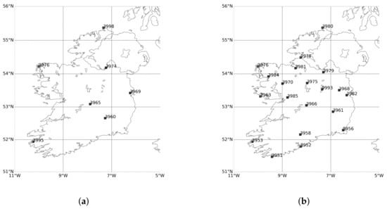 A GHI network was established in Ireland in 1954 when the first pyranometers were installed by the Irish Meteorological Service, Met Éireann, at Valentia Observatory in the southwest of the country. Over the next few decades, a further six stations were added to the network, the locations of which are shown in Figure 1a []. From 2008 onwards, the network underwent a process of automation with some of the original stations moving to more appropriate nearby sites. This automated network (referred to as the TUCSON network) is shown in Figure 1b. The stations are equipped with Kipp and Zonen CMP11 pyranometers (2628 XH Delft, Netherlands) which are “Secondary Standard pyranometers”, but are more accurate than “First Class Pyranometers”.