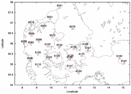 Since the beginning of 2001, the Danish Meteorological Institute, DMI, has measured GHI at 13 stations across Denmark. In the years up to 2011, this network was expanded to include 28 stations that are all still operational. The distribution of these stations across the country can be seen in Figure 2. Before 2001, the sunshine duration has been monitored since 1920 []. The GHI stations are all equipped with Star 8101 pyranometers (Schenk GmbH, A-1210 Wien, Austria), which are “First Class Pyranometers” according to the ISO 9060 standard.