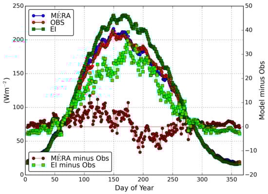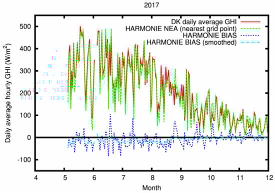 In Figure 4, the observed and modelled time series of the average of all Danish GHI stations are shown. The averages are hourly averages over the full day. As only seven months of data were available, these results are less clear than the MÉRA results, but an average negative bias of −10 to −20 Wm−2 can be seen in the period from June to September, while the last three months have little bias.