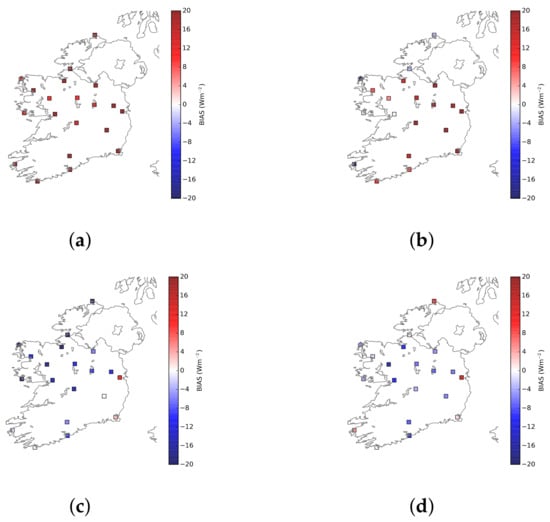 Monthly mean bias (W/m−2) for (a) March (b) June (c) August and (d) October using observations and MÉRA data for the period 2008 to 2014.