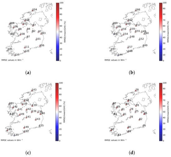 Monthly mean RMSE. The colours show the RMSE scaled by monthly mean GHI (%) for (a) March (b) June (c) August and (d) October using observations and MÉRA data for the period 2008 to 2014. The RMSE in Wm−2 are marked on the plot.