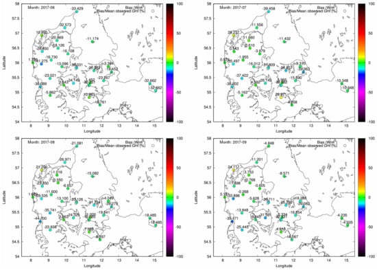 Monthly mean biases in GHI per station in Denmark for the months of June, July, August and September in 2017. The colour shows the relative GHI bias with respect to the measured GHI.