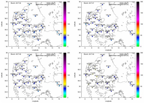 Monthly mean RMSE per station in Denmark for the months of June, July, August and September in 2017. The colour shows the relative RMSE with respect to the measured GHI.