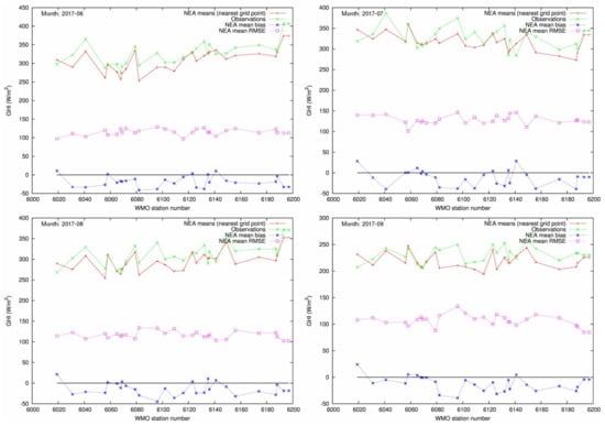 Monthly mean observed (green curves) and modelled (red curves) GHI for each station in Denmark for the months of June, July, August and September in 2017, shown as graphs with the station numbers on the x-axis. Bias (blue curves) and RMSE (magenta curves) are also shown for each stations.