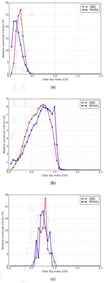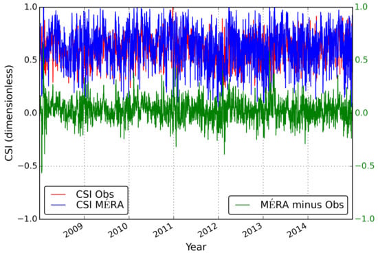 Figure 10 shows a time series of weighted daily CSI for MÉRA, calculated using hourly CSI weighted by hourly GHI and summed over the day for hours when the sun was above the horizon. Note that GHI for each hour was calculated using the accumulated GHI for consecutive hours extracted from the 0 to 33 h forecasts run at 00 Z . CSI was also averaged over all stations, and a 30-day running mean was applied to aid visualisation. CSI trends based on observations and on MÉRA are shown in the figure, as well as the bias in MÉRA relative to observations. On average, there is very good agreement between MÉRA and observations, but monthly mean biases in daily weighted CSI of ±0.2 can be seen. Figure 11 shows a frequency distribution of weighted daily CSI for the TUCSON stations. Overall, there is good agreement, but a small shift towards higher CSIs in MÉRA for most of the stations. MÉRA has significantly more cases for the lowest CSI bin, i.e., for clear sky indices from 0.0 to 0.1, than the observations.