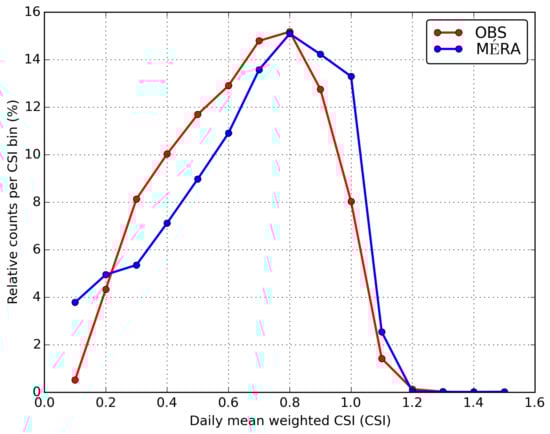 Frequency distribution of daily mean CSI (weighted using hourly SW irradiance) for observations and MÉRA data using data for the period 2008 to 2014.