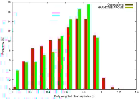 Similarly, the frequency distribution of the Danish daily weighted CSIs are shown in Figure 12. In this case, the modelled CSIs never exceed 1.0, but the observed CSIs do so in approximately 3% of the cases. In the lower part of the frequency distribution, it can be seen that the NEA HARMONIE-AROME runs have significantly more cases in the lowest CSI bin, i.e., for clear sky indices from 0.0 to 0.1, than the observations, as was also seen for the MÉRA data (Figure 11).