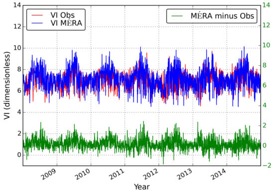 Time series of daily variability index averaged over all Irish TUCSON stations. Thirty-day averaging is applied. Observations, MÉRA data and the bias in MÉRA relative to observations are shown. Data for the period 2008 to 2014 are included.