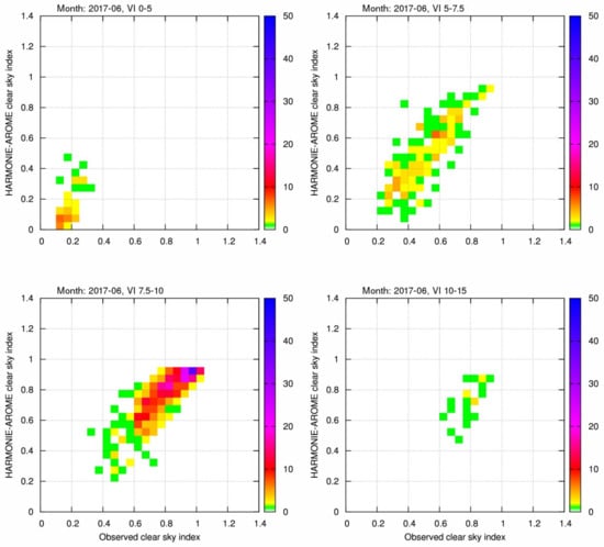 2D histograms of the binned Danish HARMONIE-AROME NEA CSI values as a function of the observed CSI values for the month of June 2017. The results are divided into four VI bins with the ranges: upper left, VI 0 to 5; upper right, VI 5 to 7.5; lower left, VI 7.5 to 10; lower right, VI 10 to 15.