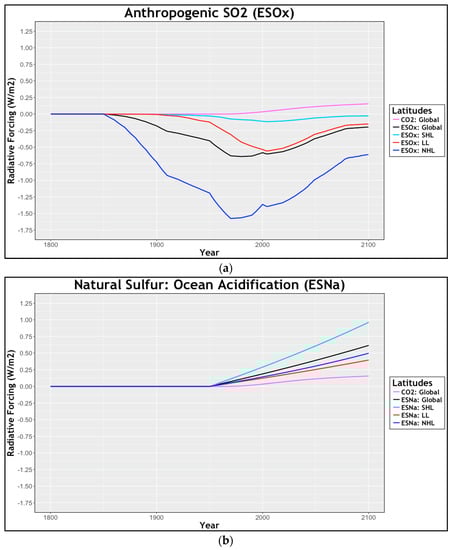 Equation (2) requires RF values for both natural and anthropogenic sulfur emissions on a global and regional scale. While a planetary anthropogenic sulfur emissions (ESOx) forcing term is supplied by Hector (−0.6 Wm−2), the forcing value needed to be additionally divided in order to determine local variations. A useful table displayed in Smith et al. (2011) [] tabulated SO2 emissions by country. This enabled a geographical restructuring of pollutants into latitudinal ranges designated for our work—SHL (90–30° S), LL (30–30° N), NHL (30–90° N). To continue a strict methodology of assigning sulfur dioxide emissions, records attributed to “International Shipping” were excluded from local divisions, as they did not have a clear point of origin and produced a negligible flux on a regional scale. However, the vessel’s contributions were reintegrated upon calculation of a global average. A breakdown of values and locations can be viewed in Appendix A. After calculating man-made emissions derived within each hemispheric band, percentage totals were easily evaluated, yielding 5%, 22%, and 64% of the global total for the SHL, LL, and NHL, respectively. These allotments were applied to the planetary average forcing provided by Hector (−0.6 Wm−2), producing values of −0.11, −0.54, and −1.57 Wm−2.