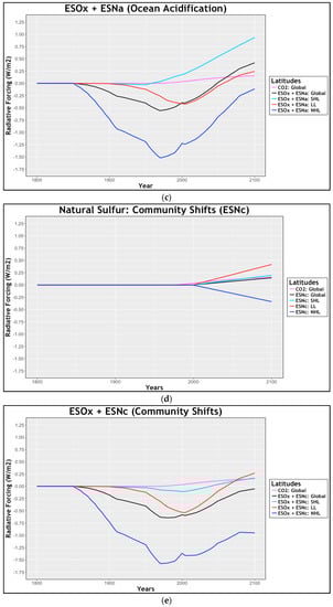Impacts the sulfur and CO2 marine biogeochemical (mBGC) feedbacks have on the global radiative forcing budget, from 1800 to 2100. Included in the illustration are CO2 global impact (pink), global average sulfur impact (black), southern high-latitude sulfur impact (90–30° S) (light blue), low-latitude sulfur impact (30–30° N) (red), and northern high latitude sulfur impact (30–90° N) (blue): (a) anthropogenic SO2 and CO2 forcings; (b) natural influence of sulfur with respect to ocean acidification []; (c) natural and anthropogenic sulfur forcings taken together while considering acidification; (d) natural influence of sulfur with respect to community shifts; (e) natural and anthropogenic sulfur forcings accounting for phytoplankton community shifts.