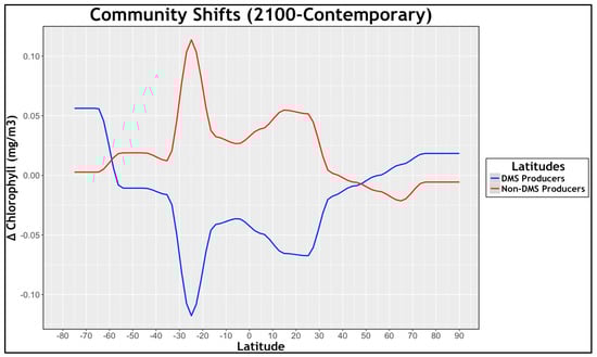 To analyze community shifts for cyanobacteria, data derived from F13 were used []. Two picocyanobacterial genera—Synechococcus and Prochlorococcus—demonstrate the growth of cyanobacteria, since they outcompete and supersede their DMS producing counterparts. Flombaum’s group measured the progression of cell abundance, allowing us to establish a percentage change. A minor adjustment was made, since changes reported by F13 were derived from an RCP4.5 scenario. Under these parameters, the ocean would simply warm on average by 1.4 °C relative to 5.5 °C from an RCP8.5 future [,]. Operating with outputs from Flombaum and the 4.5 pathway temperature increase, we used a slope to calculate cell count growth under the more severe 8.5 scenario while assuming no differential adaptation to the higher temperatures. Ultimately, these changes were applied to modern values, deriving future concentrations at each latitude.