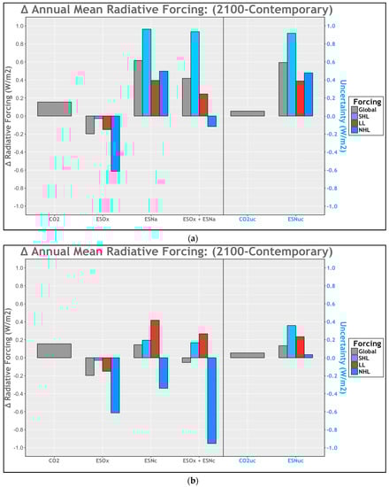 Results from the investigation are shown in histogram format. Representative global (gray) and regional changes—southern high latitude (SHL: 90–30° S) (light blue), low latitude (LL: 30–30° N) (red), northern high latitude (NHL: 30–90° N) (blue). Included in order: the change in radiative forcing from CO2 mBGC feedback (CO2), anthropogenic SO2 (ESOx), natural sulfur (ESN), combined man-made and natural sulfur (ESOx + ESN), CO2 uncertainty (CO2uc), and natural sulfur uncertainty (ESNuc): (a) results with respect to ocean acidification; (b) findings from our examination of planktonic community shifts.