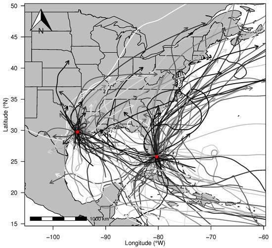 For this study, any TCs are included that may have produced rain for Houston or Miami. Keim et al. [22] show that major hurricanes (wind speeds ≥ 50 ms) can have TC force winds (≥18 ms) as far as 360 km wide. Recent studies also note the size of rain fields in landfalling TCs. Matyas [23] shows that U.S. landfalling hurricanes had average rain field extent of 223 km, and the average width of right and left sides for Gulf Coast landfalling hurricanes were 295 and 196 km, respectively [24]. Additionally, rain field size increased after landfall [24,25]. For this study, all TCs landfalling within 180 km of each city center are found using the computer program R to identify those events from HURDAT2. Reliable and complete rainfall data sets extend to 1950, so for the purposes of this study, all TCs influencing these cities from 1950–2017 are included. Note that HURDAT2 is not updated through 2017. Hurricanes Harvey (Houston) and Irma (Miami) were added to the data sets because rainfall data fromthose events are presently available as described below. Figure 1 shows the tracks influencing both cities (n = 37 and n = 68 for Houston and Miami respectively). The tracks are shaded to denote Saffir-Simpson scale wind speeds. The lightest tracks are those TCs with tropical storm wind intensity (≥18 ms) and the darkest tracks indicate TCs with Category 5 wind intensity (≥70 ms).