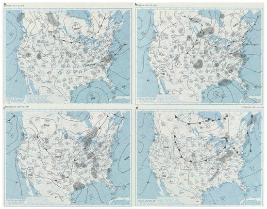 On Sunday, 22 July, a tropical low-pressure system forms in the Central Gulf of Mexico (Figure 2a). By the following day, the storm has formed a center of circulation with wind speeds greater than 18 ms, has moved northwestward, and the storm is named “CLAUDETTE” (Figure 2b). During the next three days, Hurricane Claudette hovers over Southeast Texas, and the DWMs indicate rainfall occurring at 7:00 a.m. EST in Houston for each of those days (Figure 2c). Finally, on Saturday, 28 July, the low pressure from Hurricane Claudette has weakened and moved to Northern Arkansas (Figure 2d). After tracking the hurricane with DWMs, it is catalogued that Hurricane Claudette possibly produced rain over six days (22–27 July). The final step references daily rainfall readings for the weather station at Houston Hobby Airport for the indicated days. Rainfall was recorded for each day during that period for a total of 292.86 mm (11.53 in).