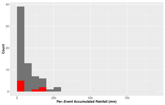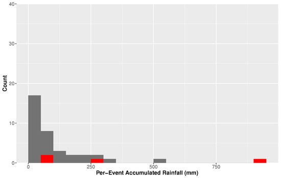 Histogram for tropical cyclone rainfall for Houston, Texas. Red bars indicate events post 2007.