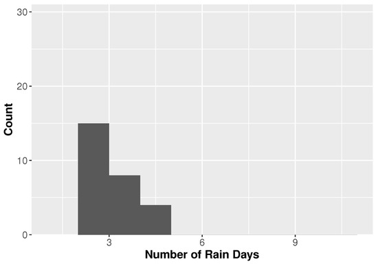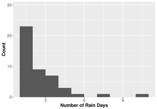 The duration that a TC remains over a location may affect the amount of rainfall in an area. Figure 5 and Figure 6 show histograms for the number of hours that each TC produced rain for Houston and Miami, respectively. The majority of TCs at each location produce rainfall for fewer than 4 days at each location with a mean of and the largest number of TCs producing rain for no more than 48 h. However, the longest TCs in Houston last nearly twice as long as those in Miami.