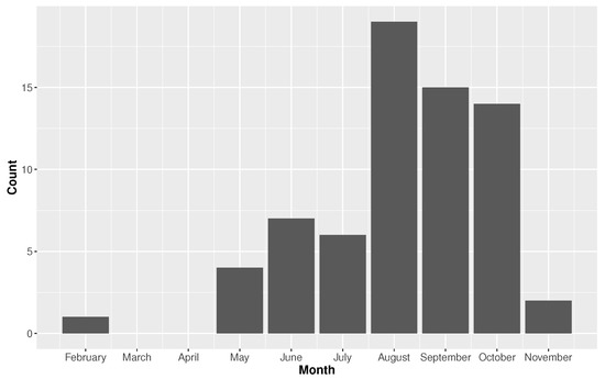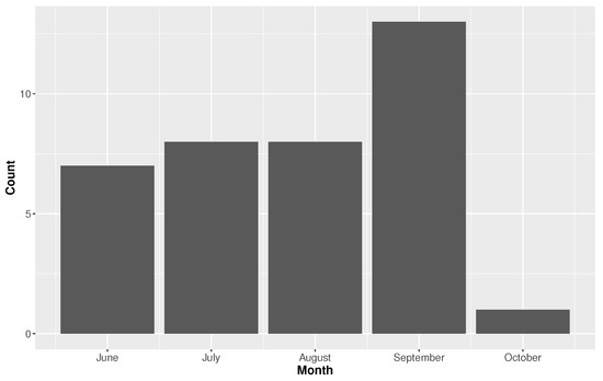 The season for North Atlantic hurricanes runs from 1 June through 30 November. The seasonality varies depending on location. Figure 7 and Figure 8 showcase the monthly distributions of TC rainfall for Houston and Miami, respectively. The season is longer in Miami, with events occurring as early as February (note, this is prior to the official season start date) and as late as November. The February event was an unnamed event from 1952. The bulk of the Miami season begins in May with a peak in August, followed by September and October. The season dramatically slows down after October. In comparison, Houston has a much shorter TC season. The events begin in June and peak in September. After September, TC rainfall activity essentially diminishes. The risk of rainfall intensity seems to be higher in Houston, but the duration of risk is longer in Miami.
