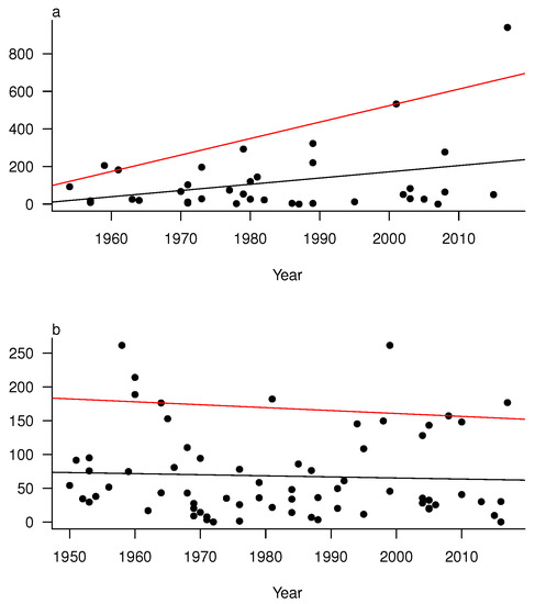 Time series plots with year on the x-axis and accumulated rainfall amounts on the y-axis. Black lines indicate the ordinary least squares regression model and red lines are the models at the 90th percentile. (a) Houston, Texas. (b) Miami, Florida.