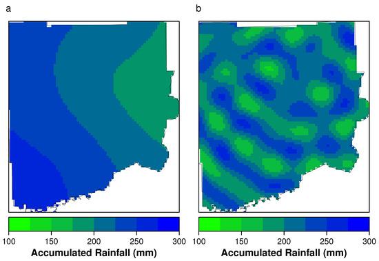 Interpolated rainfall map for Miami, Florida during Hurricane Irma 2017. (a) Kriging model with Bessel variogram. (b) Kriging model with Periodic variogram.