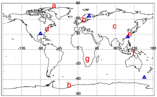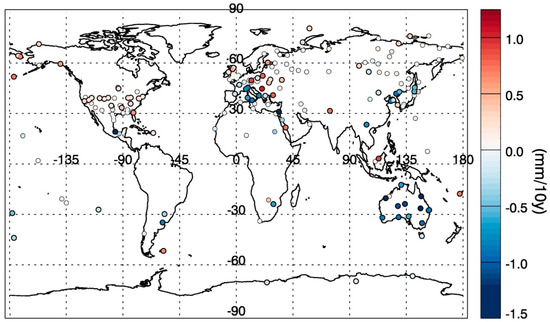 Since there are more than 60-year measurements from IGRA radiosonde observations, long-term changes in global PWs can be obtained. Stations with 60 complete years of PW observations are plotted and stations with significant trends are marked with bold black circles in Figure 8. It can be found that most significant trends occur at those stations of the United States (US), Europe and Australia. PWs at all Australian stations present statistically significant decreasing trends in the last 60 years, while PWs at most stations in the US have increasing trends. Ross and Elliott [6,7] and Durre et al. [8] both reported the increasing trends of PW in the US region during 1973–2006, which is consistent with our results.