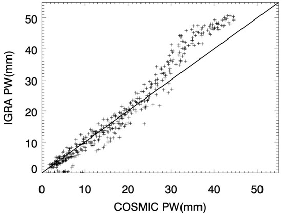 PW peaks in the tropical area with average values of 40 mm. The larger differences shown in Figure 3 are assumed to be in this region, where PWs are generally larger than 30 mm. The scatterplot in Figure 3 shows the latitudinal averaged results. The COSMIC PWs contain the information of both ocean and lands, while the IGRA PWs mainly show the results on land. According to Figure 4, the IGRA stations usually located in the hot spots in the tropical region. This may be the reason for the IGRA PWs being larger than the COSMIC PWs in the region with PWs larger than 30 mm.