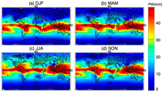 The comparison of global averaged PW between IGRA and COSMIC in four seasons during 2007–2016 is presented in Figure 4. The colored dots denote the results from IGRA radiosonde observations. The radiosonde stations are distributed unevenly in the Northern and Southern Hemispheres, and over 80% of radiosonde stations are in the Northern Hemisphere. Meanwhile, in the Southern Hemisphere, most stations are located in the continent of Australia and equatorial regions to the north of Australia. The dominant seasonal variations of PW derived from two observations are similar.
