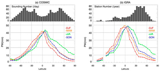 In order to investigate the detailed latitudinal variability of PW, zonal mean values are obtained in latitudinal bins. The numbers of soundings (COSMIC) and stations (IGRA) in each latitude bin are presented in Figure 5. Note the sparse radiosonde station distribution in the southern hemisphere, which brings a larger uncertainty to the radiosonde results in this region (Figure 5b). In general, the patterns of the latitudinal variation of two observational datasets are quite similar. These patterns are also consistent with the global precipitation variation decreasing from the tropics to two poles reported by Luo et al. [28]. In the Southern Hemisphere, PWs are very similar in different seasons; while in the Northern Hemisphere, PWs in four seasons show larger differences in magnitude. For example, PW in the Northern Hemisphere summer is obviously larger than in the other three seasons, especially for the region with latitudes larger than 30° N. It is consistent that larger PW values occur in the summer of the Northern Hemisphere, as mentioned in Figure 4.