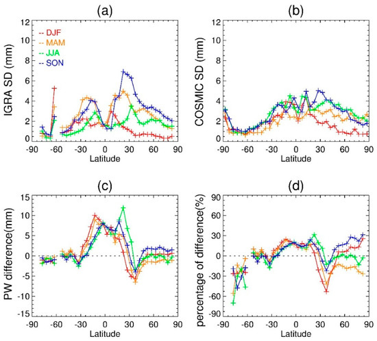 (a) One standard deviation of the seasonal PW in latitudes of IGRA data; (b) one standard deviation of the seasonal PW in latitudes of COSMIC data; (c) latitudinal variation of differences between IGRA and COSMIC (difference = IGRA PW − COSMIC PW); (d) latitudinal variation of percentage of PW differences between IGRA and COSMIC (percentage = difference/(IGRA PW + COSMIC PW)/2).