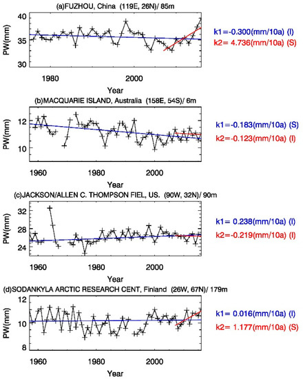 Trends in PW at four stations: (a) Fuzhou, China; (b) Macquarie Island, Australia; (c) Jackson/Allen C. Thompson Fiel, US and (d) Sodankyla Arctic Research Cent, Finland. Blue linear lines represent trends during 1957–2016 and red linear lines represent trends for last decade (2007–2016). k1 and k2 represent the slopes of the linear lines. S represents trend significant at the 95% confidence level or greater; I denote the insignificant trend.