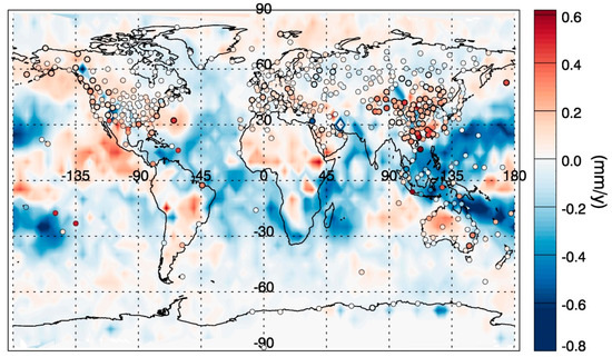 Besides the long-term trend in PW, we are more focused on PW changes in the recent 10 years. Since COSMIC observations perform quite well in comparison with radiosonde data and, more importantly, are covered globally and evenly, they can complement the limitation of IGRA observations. Based on COSMIC and radiosonde observations from 2007–2016, Figure 9 presents the global changes in PW during the most recent decade. It shows an overall similar trend pattern in PW. For most ocean regions, PW has been decreasing in the last 10 years, especially in the tropical area. Except for the Antarctic and inland of the Eurasian continent lands, most land areas show a statistically significant increasing trend in PW. In addition, for North America and European region, PWs have been increasing for the last 10 years and also for last 60 years. On the other side, in Australia, Eastern Asia, and Mediterranean region, PW has been decreasing for last 60 years, but with increasing trend in the recent decade. Due to the lack of data accumulations, most Asian stations are not suitable for long-term trend analysis but show statistically significant increasing trends in the last decade.