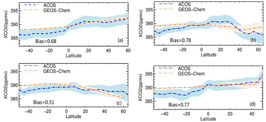 XCO2 concentrations of GOSAT/ACOSv7.3 and GEOS-Chem averaged over 5° latitude bins during March 2010–February 2011: (a) MAM; (b) JJA; (c) SON; (d) DJF. Blue lines denote the latitudinal mean GOSAT/ACOSv7.3 XCO2 data, with the light blue envelope representing their standard deviation. Orange line and light orange envelope denotes the latitudinal mean GEOS-Chem XCO2 concentrations and their corresponding standard deviation.