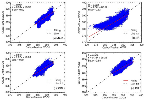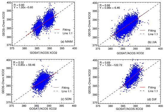 The seasonal correlation coefficients of XCO2 between GOSAT/ACOS and GEOS-Chem in Figure 3 show that best correlation (R = 0.80) is found in MAM and the poorest correlation (R = 0.52) in SON. Cogan et al. [26] also found that GEOS-Chem (v08-02) showed highest correlation with GOSAT observation (UoL-FP retrievals) in MAM.