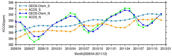 The time series variations of monthly averaged XCO2 for April 2009–December 2011 in the NH and SH between GOSAT/ACOS and GEOS-Chem. The green line denote the GOSAT/ACOS XCO2 retrievals in the NH and the orange one is in the SH; the two blue lines refers to the XCO2 simulated from GEOS-Chem in the NH and SH respectively.