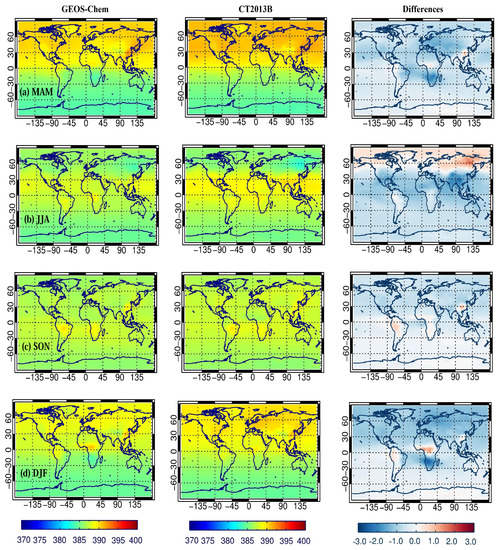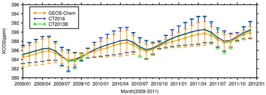 Figure 8 shows that there is good agreement among GEOS-Chem, CT2013B and CT2016 with regard to the seasonal cycle of monthly averaged XCO2 during 2009–2011. As presented in Table 1, both GEOS-Chem and CT2013B use CASA biospheric flux (GFED3 or GFED2) as their input surface flux. Lindqvist et al. [29] reported that biospheric flux is closely connected to seasonal cycle of CO2. Nearly identical time series variation of XCO2 in JJA and SON in Figure 8 between GEOS-Chem and CT2013B are probably influenced by similar biospheric flux components. This result was also reported by Lindqvist et al. [23]. However, CT2013B Document [59] have found that the newer CASA-GFEDv3 product has a smaller seasonal cycle than the older CASA-GFEDv2. Compared with the time series of CT2013B, the global XCO2 simulated from GEOS-Chem were slightly underestimated on the whole, which may be due to the newer CASA-GFEDv3 biospheric flux used in GEOS-Chem, as well as different transport models or the assimilation of observation data (e.g., GLOBALVIEW data) from CT2013B. Furthermore, the CT2013B show nearly identical variation with the CT2016 due to their similar input surface fluxes and transport models (shown in Table 1). However, due to the difference of biospheric flux version, their seasonal cycle shows a little discrepancies in JJA.