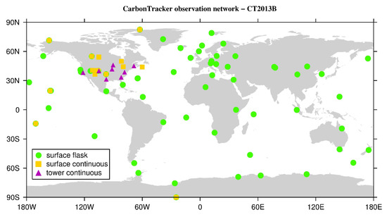 - Peters, W.; Jacobson, A.R.; Sweeney, C.; Andrews, A.E.; Conway, T.J.; Masarie, K.; Miller, J.B.; Bruhwiler, L.M.P.; Petron, G.; Hirsch, A.I.; et al. An atmospheric perspective on North America carbon dioxide exchange: Carbon Tracker. Proc. Natl. Acad. Sci. USA 2007, 104, 18925–18930. [Google Scholar] [CrossRef] [PubMed]