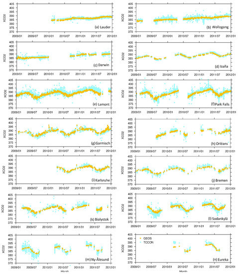 Comparison of XCO2 from GEOS-Chem (yellow dots) and ground-based TCCON XCO2 measurements (blue dots) during 2009–2011: (a) Lauder; (b) Wollongong; (c) Darwin; (d) Izaña; (e) Lamont; (f) Park Falls; (g) Garmisch; (h) Orleans; (i) Karlsruhe; (j) Bremen; (k) Bialystok; (l) Sodankylä; (m) Ny-Ålesund; (n) Eureka.
