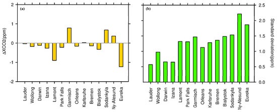 Similarly, 14 TCCON sites were also used to estimate the uncertainties of the spatial support and they include Lamont, Park Falls, Bialystok, Orleans, Garmisch, Bremen, Sodankylä, Ny-Ålesund, Izaña, Eureka, Karlsruhe, Wollongong, Darwin, Lauder. From Figure 15, the differences (standard deviation) between XCO2 at 14 TCCON sites and averaged XCO2 at 2° × 2.5° grids mainly ranged from 0–1.4 ppm and mostly distributed at 0–0.1 ppm. This result indicates that different spatial support may bring relatively large uncertainties when directly comparing TCCON sites and GEOS-Chem.