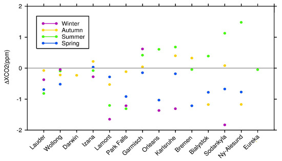 Seasonal biases can affect the seasonal cycle amplitude, and the seasonal cycle is important for biospheric flux attribution [68]. From Figure 11, in MAM and DJF, the modeled XCO2 from GEOS-Chem are underestimated at most sites, except Garmisch and Izaña. However, similar to Figure 10 and Table 3, the overestimated XCO2 occurred at the sites of high latitude of the NH in JJA, especially overestimated seasonal bias more than 1 ppm found at Sodankylä and Ny-Ålesund sites. This comparison result is also consistent with that of GOSAT/ACOS as well as CT2013B and probably related to transport model and local flux in GEOS-Chem.