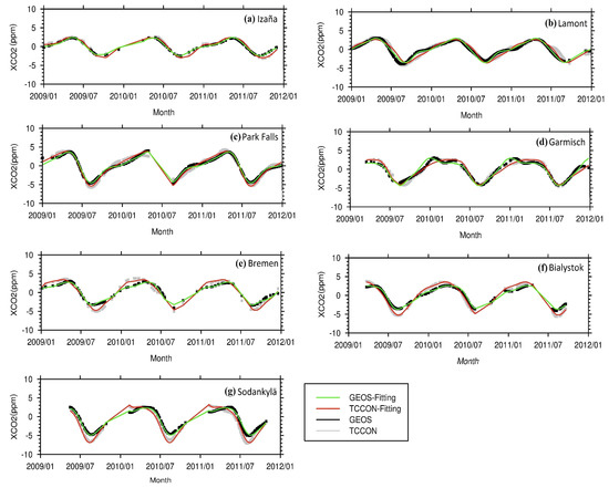 The seasonal cycle of XCO2 is closely related to the biospheric fluxes that determine the global terrestrial net CO2 sinks [23]. To compare the seasonal cycle of XCO2 from GEOS-Chem and TCCON sites, we use the NOAA fitting software CCGCRV [69] to statistically fit the seasonal cycle and yearly growth of XCO2. Constrained by short time series or large data gaps, only seven sites in the NH are used to extract the seasonal cycle of XCO2 in this study. It is noted that the detrended seasonal cycle is calculated by removing the long-term trends of XCO2. From Figure 12, the seasonal cycles in GEOS-Chem XCO2 are in good agreement with those of TCCON sites, for example, no apparent mismatches found at the Garmisch, Park Falls and Lamont sites. However, seasonal cycle amplitudes of XCO2 are obviously underestimated by GEOS-Chem at some sites, such as Bialystok, Bremen and Sodankylä sites, which may be due to the biospheric fluxes or transport in model. The result also shows consistency with previous studies, reporting an underestimation of XCO2 peak-to trough amplitudes in models [23,66]. From Table 4, the average yearly growth rate varies from 1.90 ppm year−1 to 2.37 ppm year−1 for GEOS-Chem and TCCON measurements during 2009–2011. The GEOS-Chem model shows a lower XCO2 growth rate than those of TCCON sites.