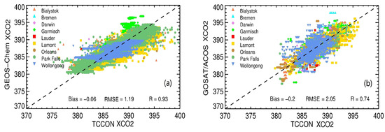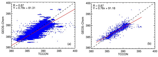 The scatter plot of XCO2 between GEOS-Chem as well as GOSAT/ACOS and 9 TCCON sites during April 2009–December 2011. (a) The scatter plot between XCO2 from GEOS-Chem and XCO2 from TCCON sites; (b) The scatter plot between XCO2 from GOSAT/ACOS and XCO2 from TCCON sites.