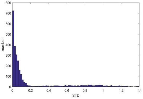 The frequency histogram of differences (standard deviations) between GOSAT XCO2 and the corresponding averaged XCO2 at 2° × 2.5° grids on the global land in 2010.