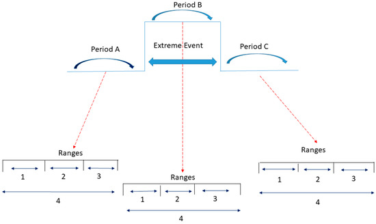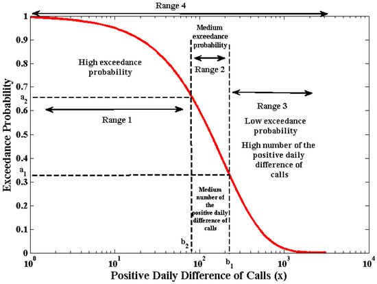 - We partition the estimated Tsallis probability distribution function for each period into three ranges by using the partitioned multiobjective risk method (PMRM). These ranges correspond to low positive daily difference of calls/high exceedance probability (Range 1), medium positive daily difference of calls/medium exceedance probability (Range 2) and high positive daily difference of calls/low exceedance probability (Range 3). The whole range (Range 4) is defined as the union of the three ranges.
