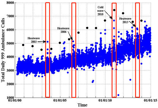 The daily total number of 999 emergency ambulance incidents (calls—blue dots) in London from 1 April 2000 to 31 December 2014. The red rectangles delimit the four extreme temperature episodes which we study in this paper. Seasonal peaks which are the spikes on the 1 January each year are marked with black dots (see text above).
