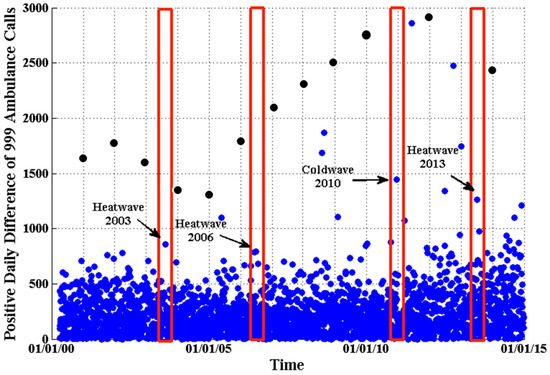Figure 2 shows the daily total number of 999 emergency ambulance incidents (blue dots) in London from 1 April 2000 to 31 December 2014. The red rectangles delimit the four extreme weather episodes which we study in this paper. Significant peaks in the number of calls are observed in December 2010 [6], in August 2003, in July 2006 and in July 2013. It is worth noting that the daily average number of calls has dramatically increased from 2000 to 2014. For example, the daily average number of calls during 2000 was 3235 whereas for 2014 was 5055. Note that this increasing trend has been removed from our analysis by windowing the extreme weather episodes of interest (see next section). Figure 2 suggests that rapid daily variations in urban temperature are strongly related to the 999 ambulance calls particularly during extreme temperature periods. These temperature increases or decreases over short time periods are fully reflected in Figure 3, which shows the positive daily difference of the total number of 999 emergency calls in London from 1 April 2000 to 31 December 2014. The positive daily difference is equal to the difference between the number of calls on one day and that of the previous day if the difference is positive, otherwise it is zero. We used the positive daily difference instead of the absolute number of calls because the time-series is nonstationary and because we are only interested in extreme positive daily deviations. There are also seasonal peaks that correspond to surges in calls on the 1 January each year during New Year’s Eve celebrations [19] (see Figure 2) and which seem to disappear from 2013 onwards. We substituted these peaks by the average number of calls. The rationale for windowing the extreme weather episodes (red rectangles) is explained in detail in the following section.