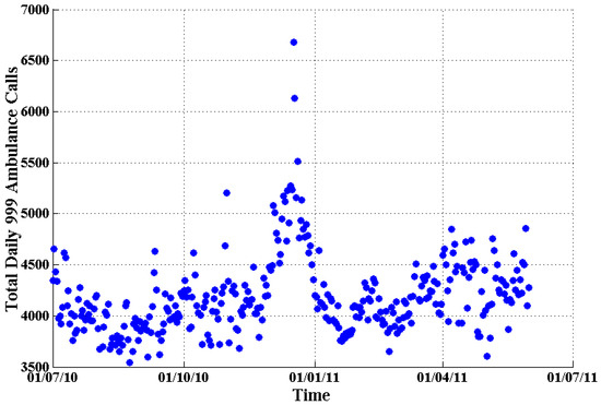 The daily total number of 999 emergency ambulance calls (blue dots) in London from 1 July 2010 to 31 May 2011.