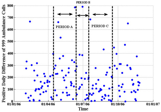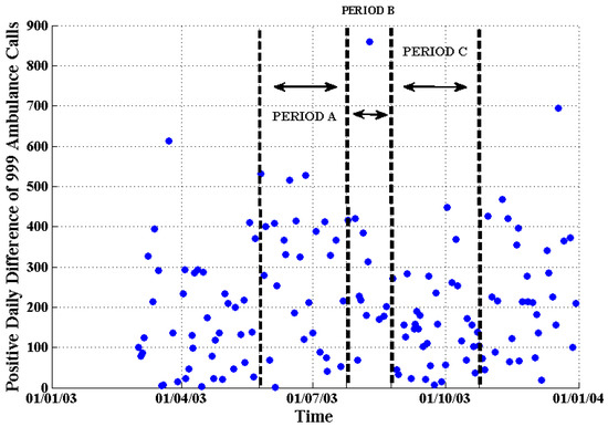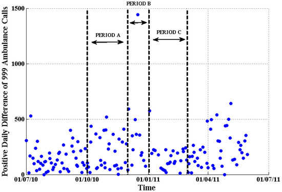 The positive daily difference of calls of 999 emergency ambulance incidents (blue dots) in London from 1 July 2010 to 31 May 2011. The dataset is divided into three periods. Period A corresponds to the period before the extreme temperature, Period B is the extreme temperature period and Period C is after the extreme temperature.